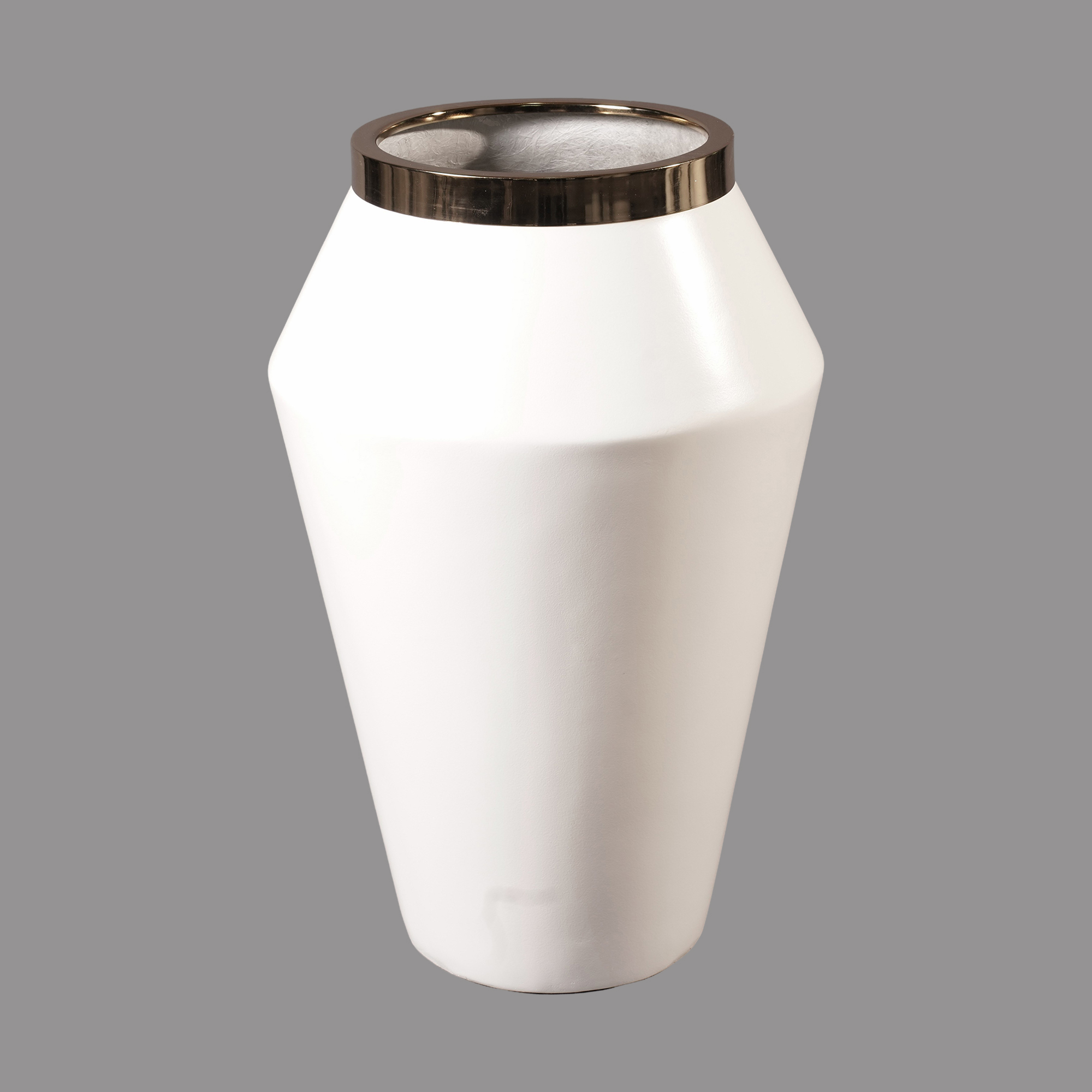 The Khomre Fiberglass Planter (MG01008) features a refined tapered silhouette inspired by traditional urn forms, reinterpreted in a clean contemporary style. The subtle mid-body curvature combined with a metallic accent ring in gold or silver finish creates a balanced contrast between classical proportion and modern minimalism.