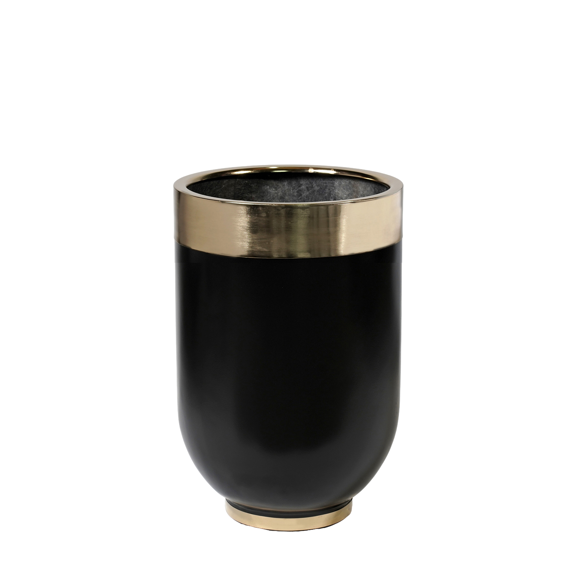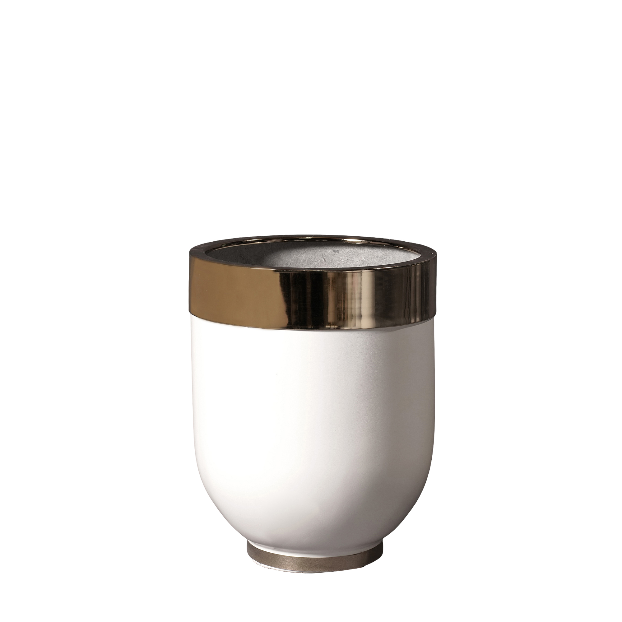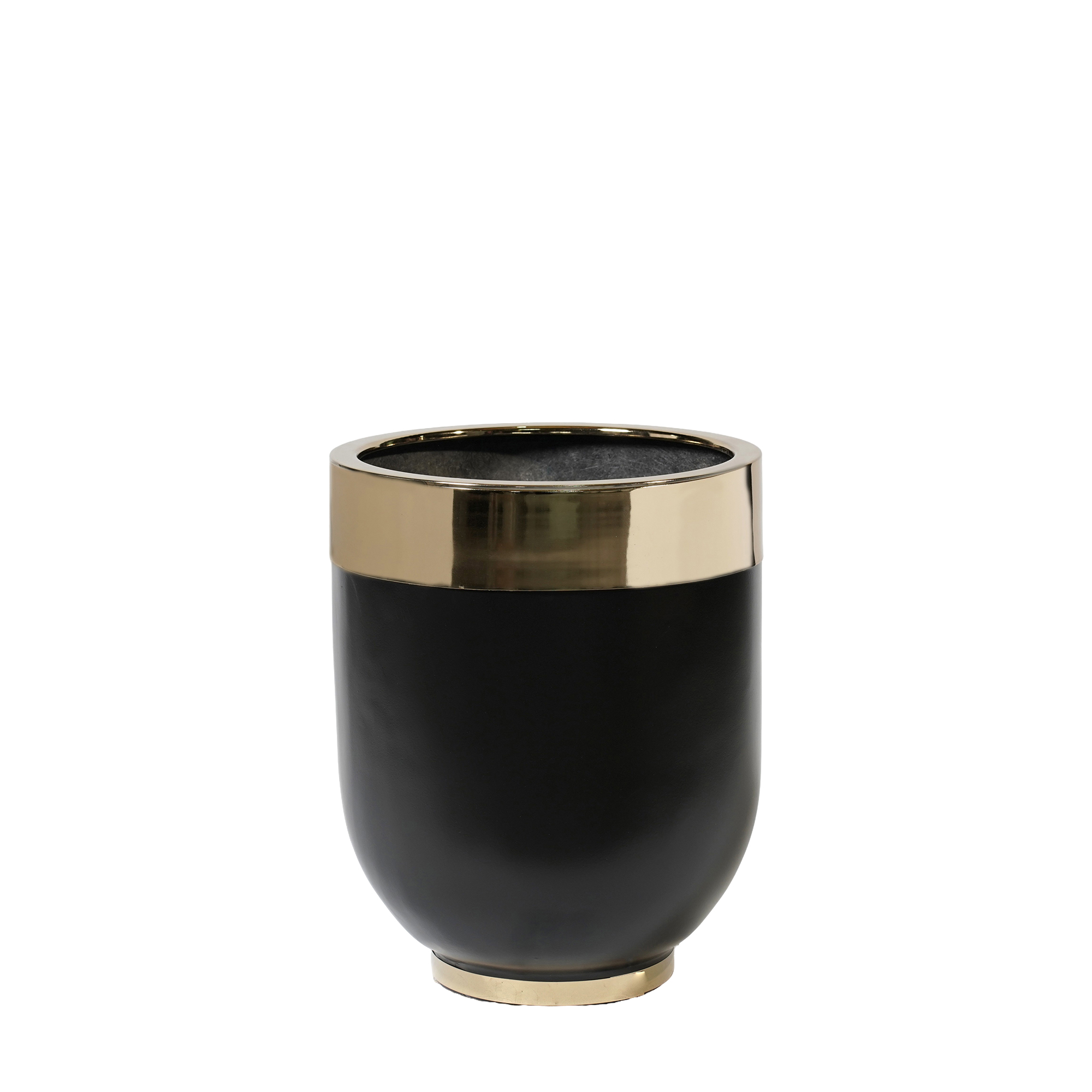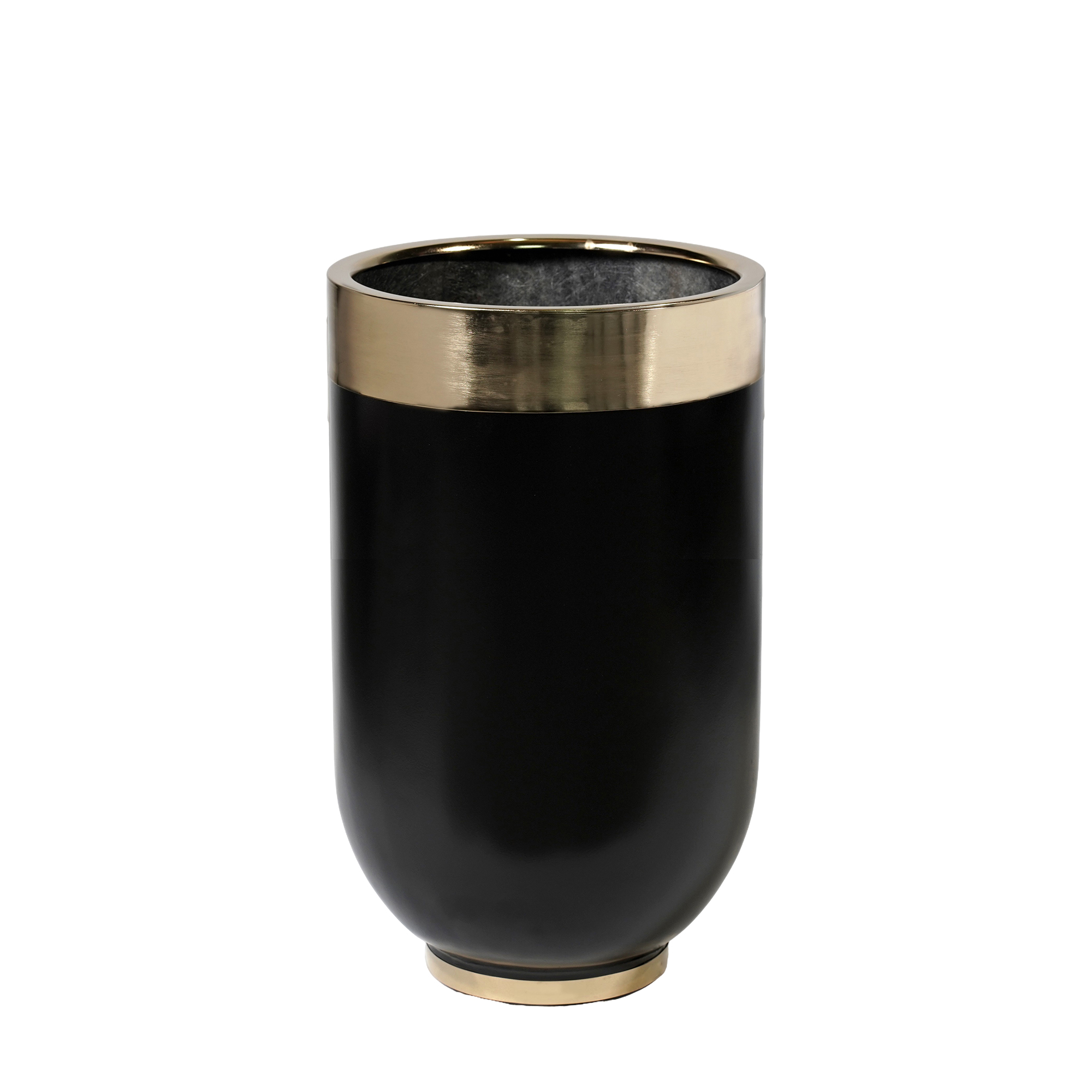 The Seri 25 Fiberglass Planter from the Sevin Collection is designed for contemporary interiors that require subtle decorative detailing. Its cylindrical form is enhanced with a metallic ring and matching base accent, available in gold or silver finish, creating a clean contrast against matte or glossy black and white surfaces.