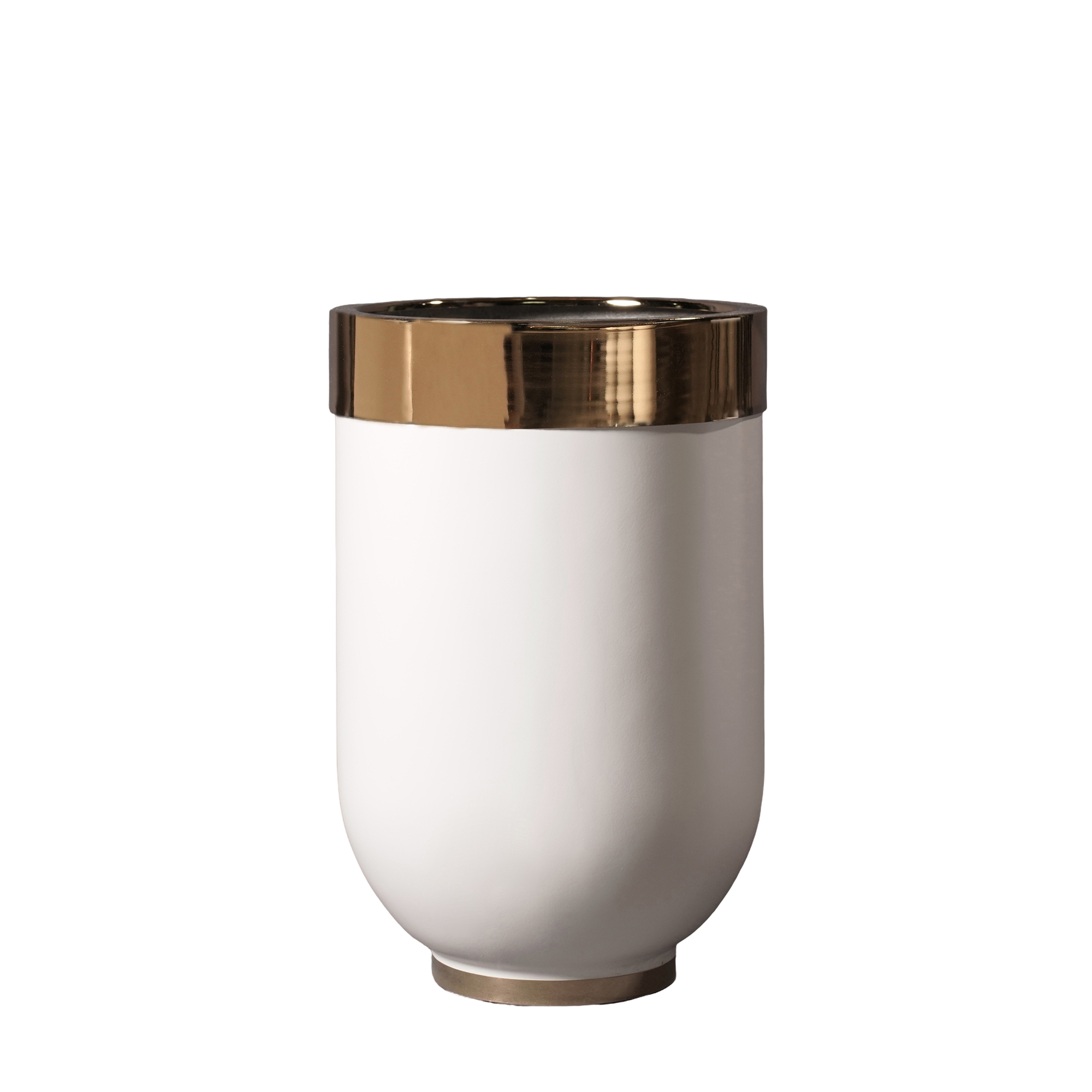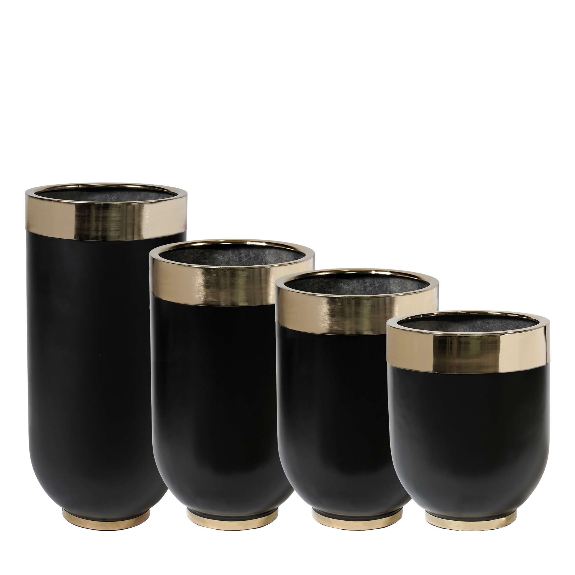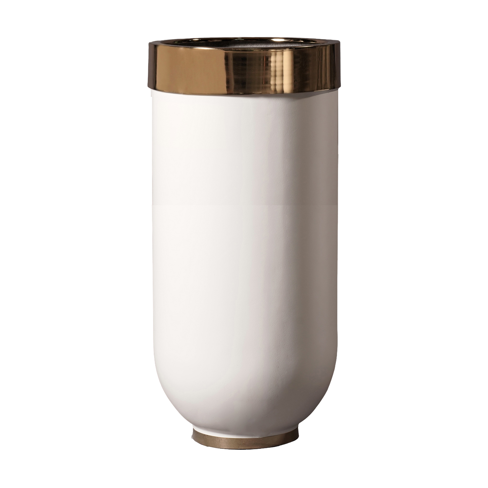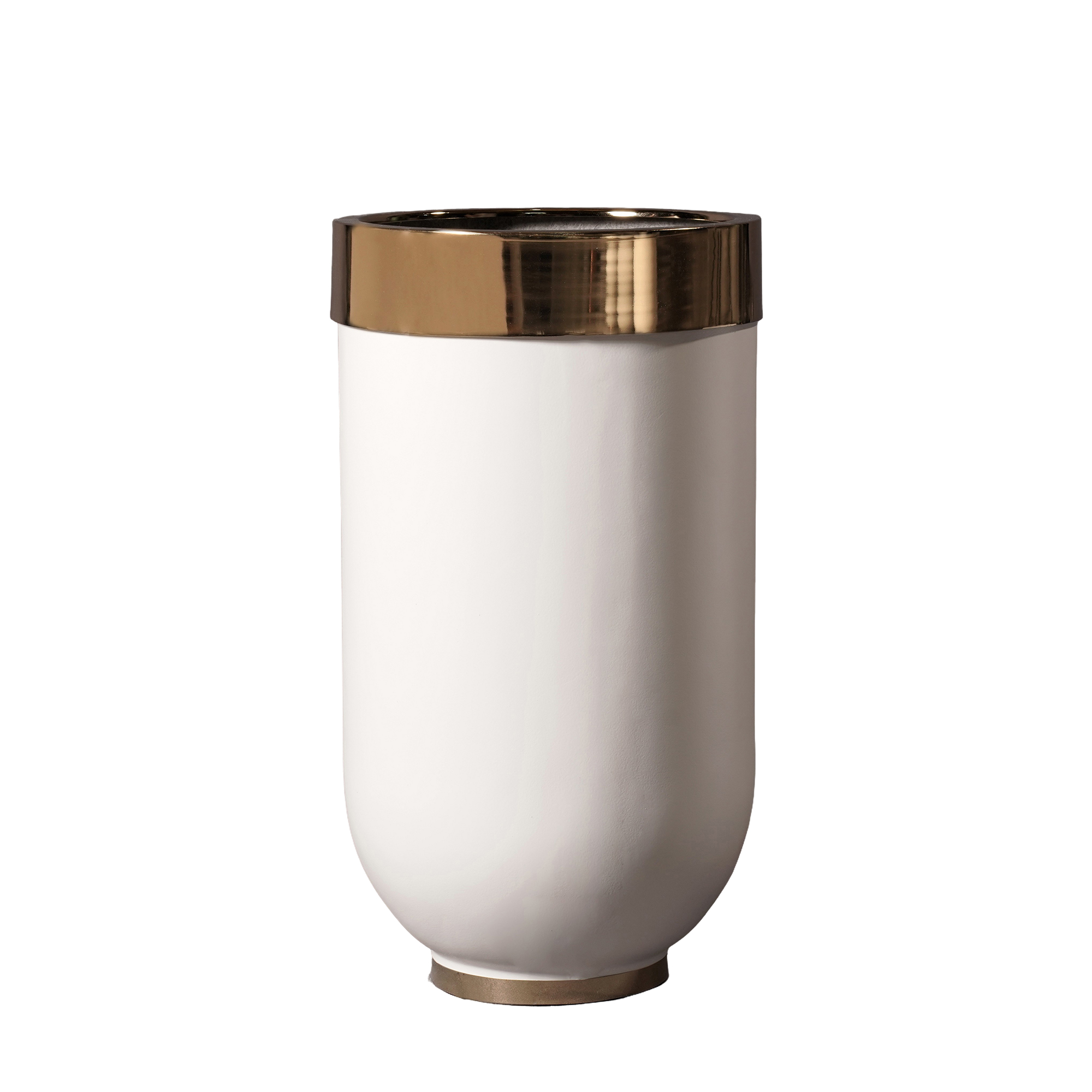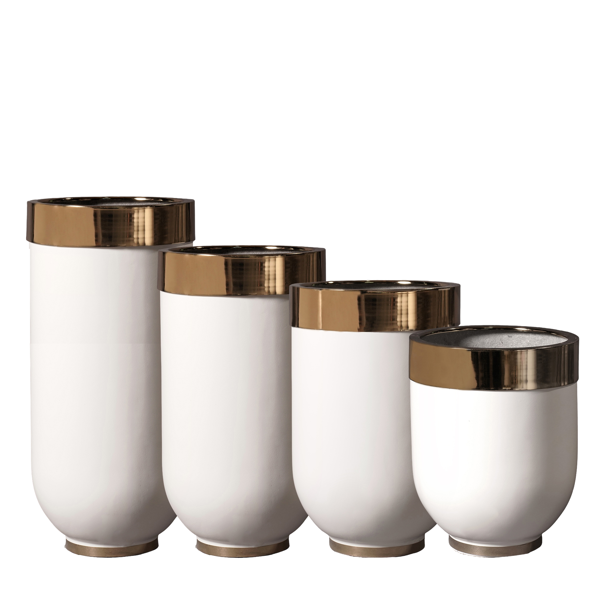 The Seri 25 Fiberglass Planter from the Sevin Collection is designed for contemporary interiors that require subtle decorative detailing. Its cylindrical form is enhanced with a metallic ring and matching base accent, available in gold or silver finish, creating a clean contrast against matte or glossy black and white surfaces.